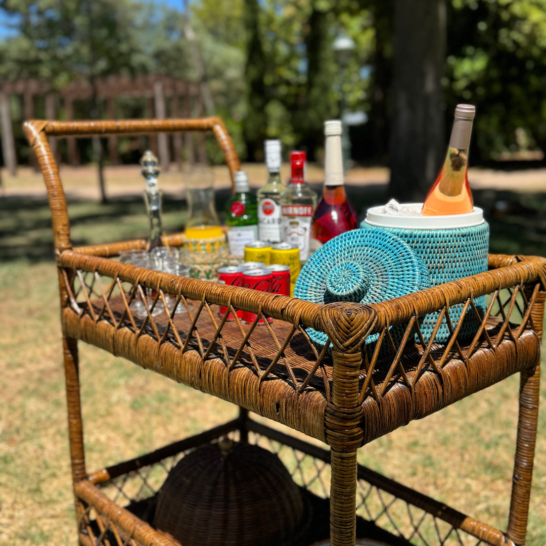 The rattan bar cart blends natural texture with timeless style, perfect for entertaining. With woven details and rolling wheels, it adds effortless charm to any space—indoors or out.