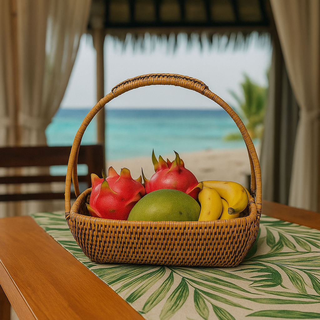 Discover our all-new rattan fruit basket with top handle, crafted in Myanmar from 100% natural rattan. Designed for design enthusiasts, it's sturdy, stylish, and perfect for elegant breakfast displays.