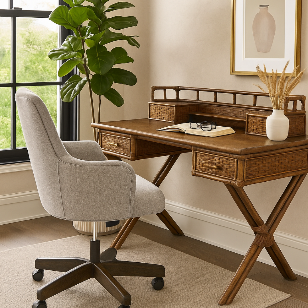 The Mandalay rattan study table Study Desk is handmade from 100% natural rattan, blending craftsmanship with organic beauty. Lightweight yet sturdy, it adds warmth and texture to any space—perfect for home offices or creative corners with a relaxed, earthy aesthetic.