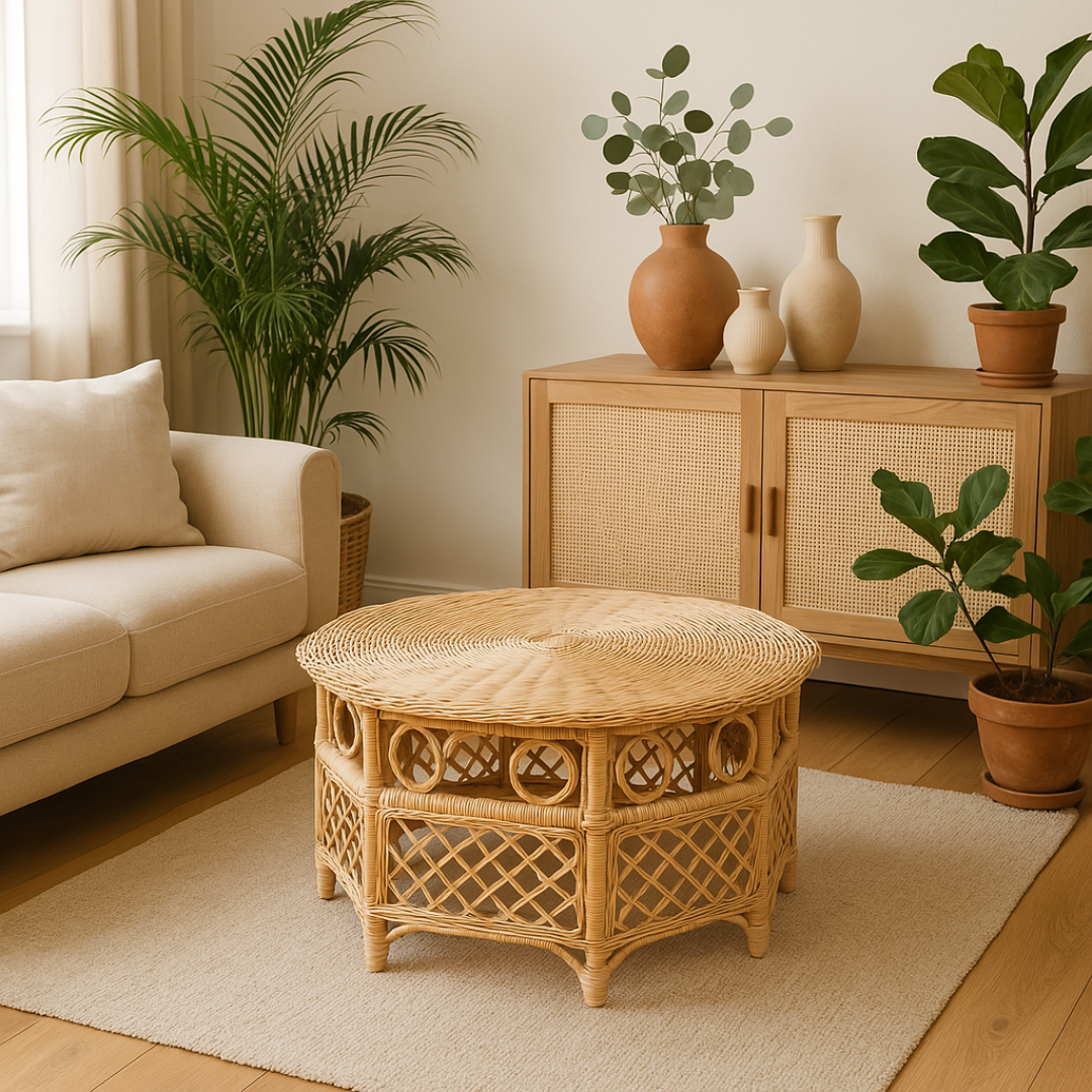 Taking inspiration from Indonesian furnishings made in the early 19th century for Sumatran Nobilities from rattan and bamboo, this rattan coffee table is made by skilled craftsmen.